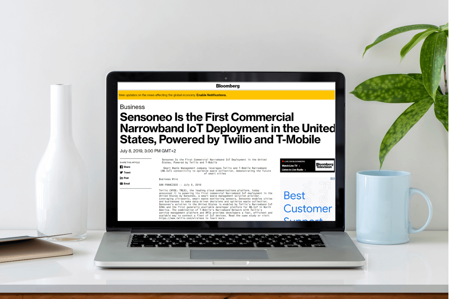 A laptop displaying an article about Sensoneo’s first U.S. Narrowband IoT deployment.