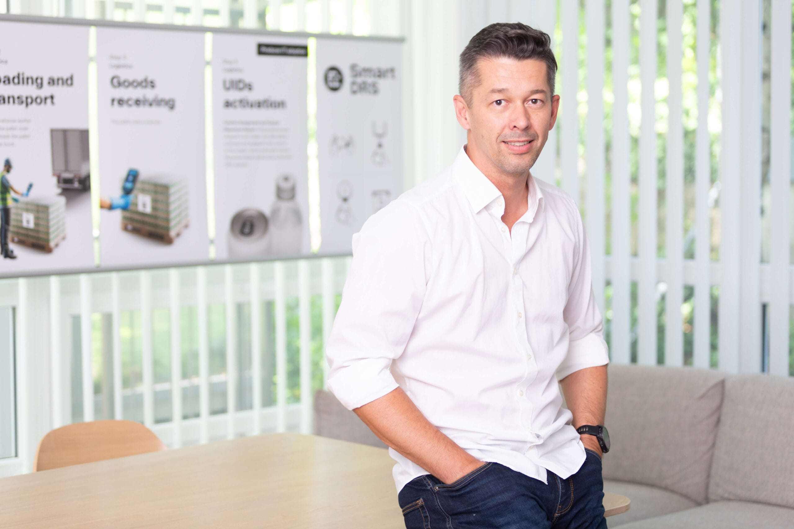 Man leaning against a table in a bright office space.
