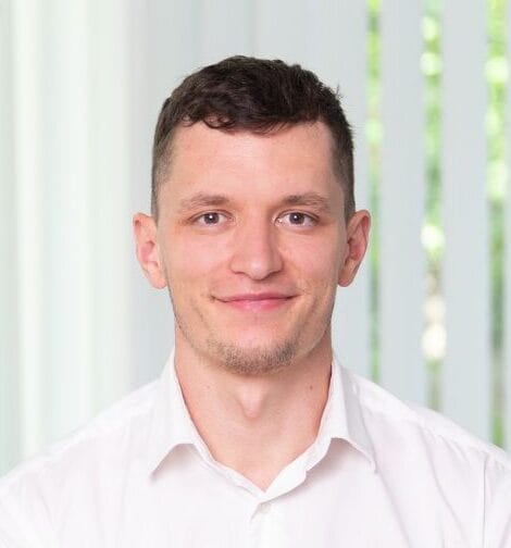 A young man in a white shirt smiles softly while posing indoors near bright vertical blinds.