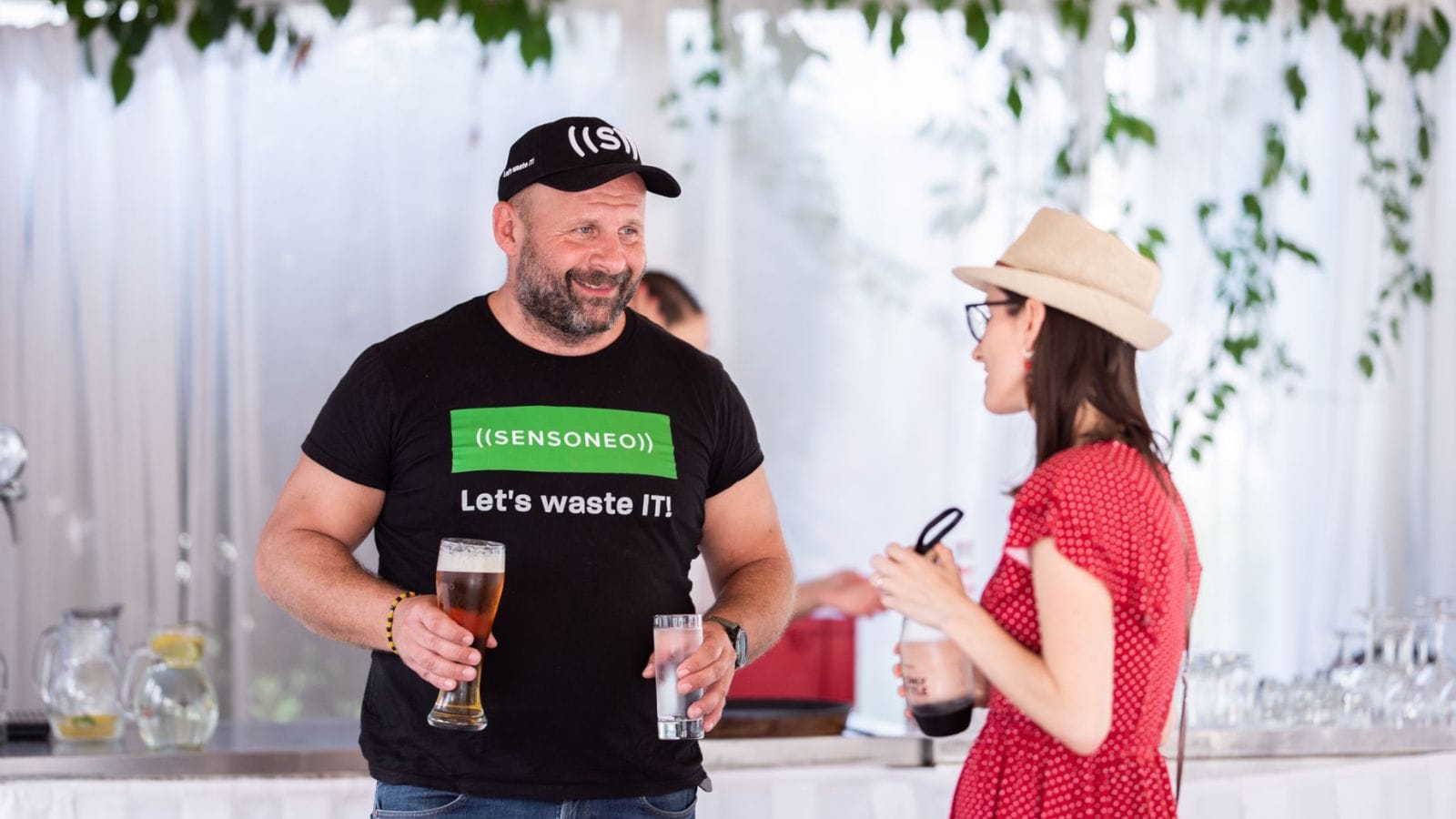 Two people chat casually at an event, holding drinks and smiling.
