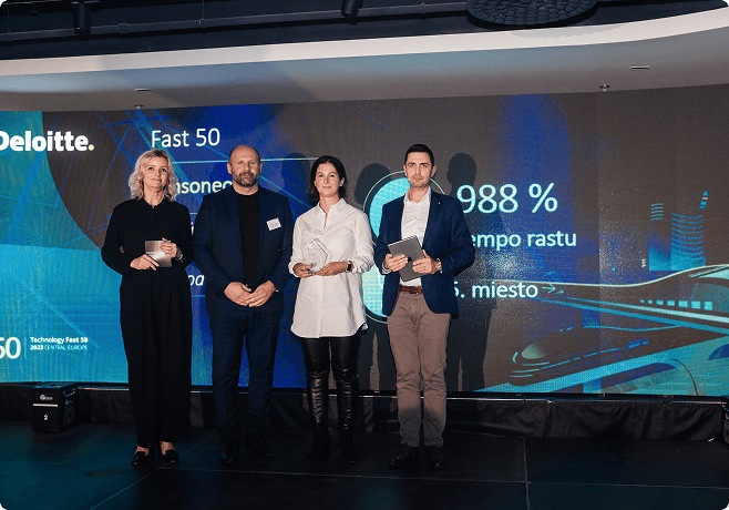 An award ceremony with four individuals holding trophies on stage.