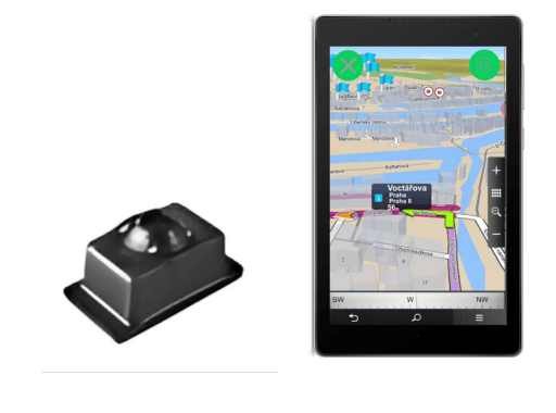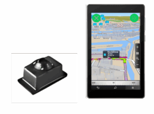 Small sensor device next to a tablet displaying a location map interface.