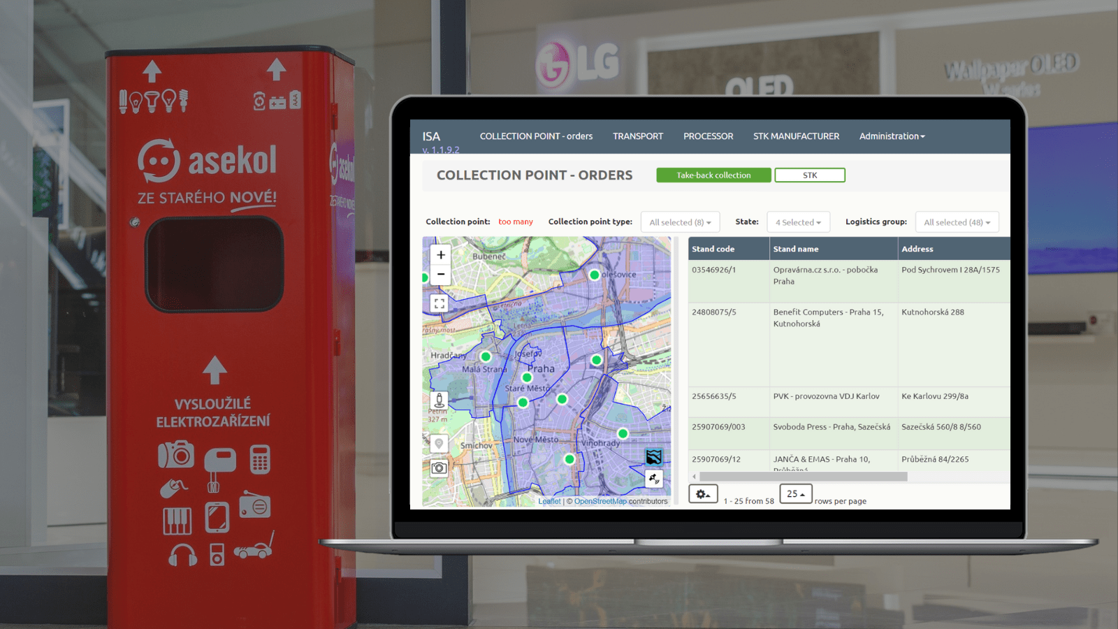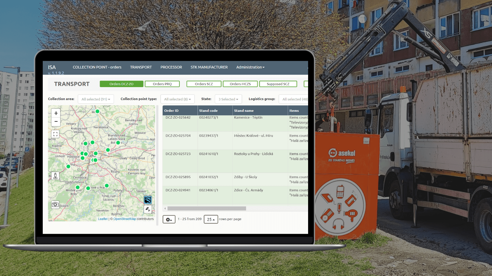 To have our system function on the scale that we work with, we need to work with data in real-time, making it our strong suit. The most excellent dynamics take place within the transport. Currently, we have around 22 000 collection points around the country – including containers and dozens of processing centers. Then, there are transport companies, which we divide into several categories. Part of them provides regional transport – which means e-waste collection from various collection points based on orders that these collection points put out. We also work with collection companies, which deal with our stationary containers using collection trucks with a hydraulic arm. Lastly, we have several transport companies for “on-demand requirements”, such as collections of large-volume containers.