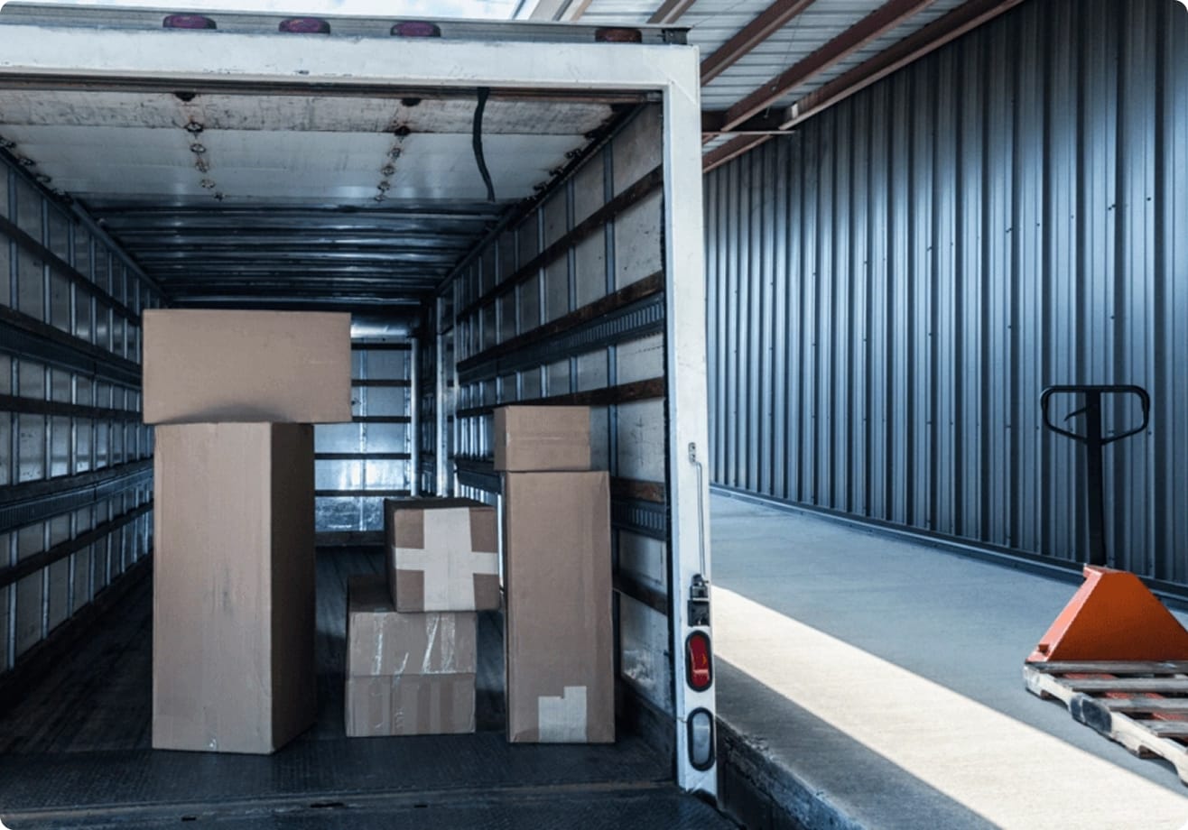 A partially loaded truck with cardboard boxes and a pallet jack inside.