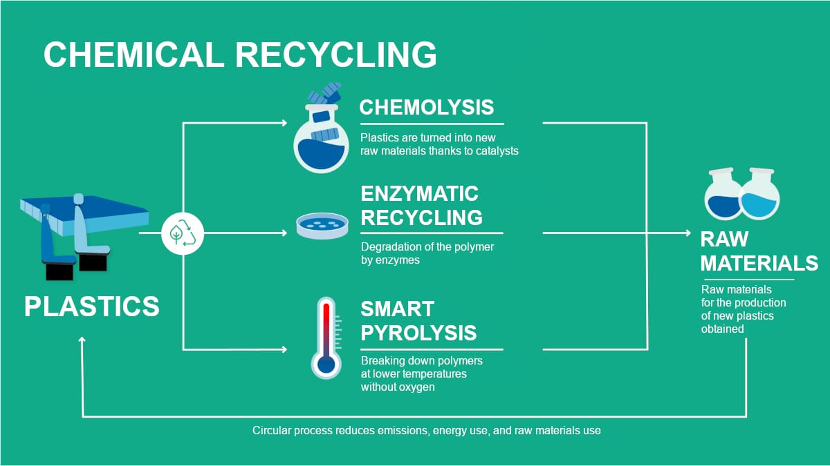 - Chemolysis: In chemolysis, polymers break down into monomers or raw materials using solvents, catalysts, heat, and sometimes pressure. Pyrolysis decomposes polymers into smaller building blocks under inert conditions at 500–800°C.