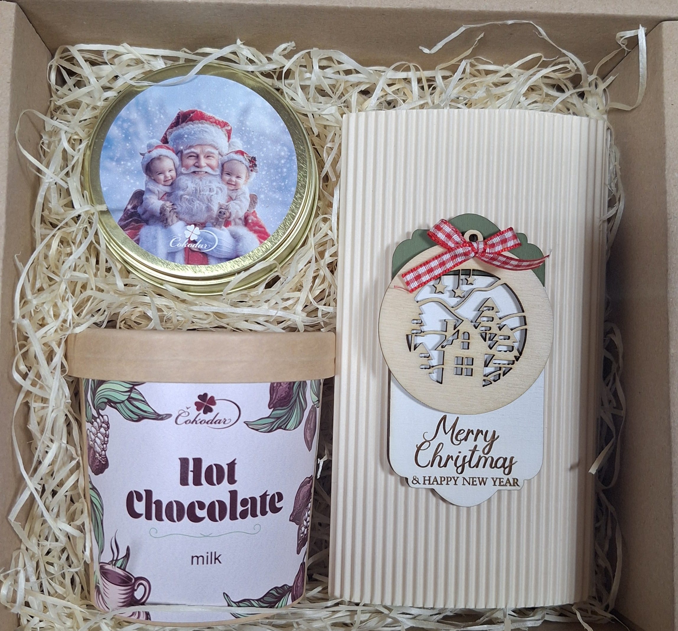 Festive gift box with Santa tin, hot chocolate, and decorated Merry Christmas package.