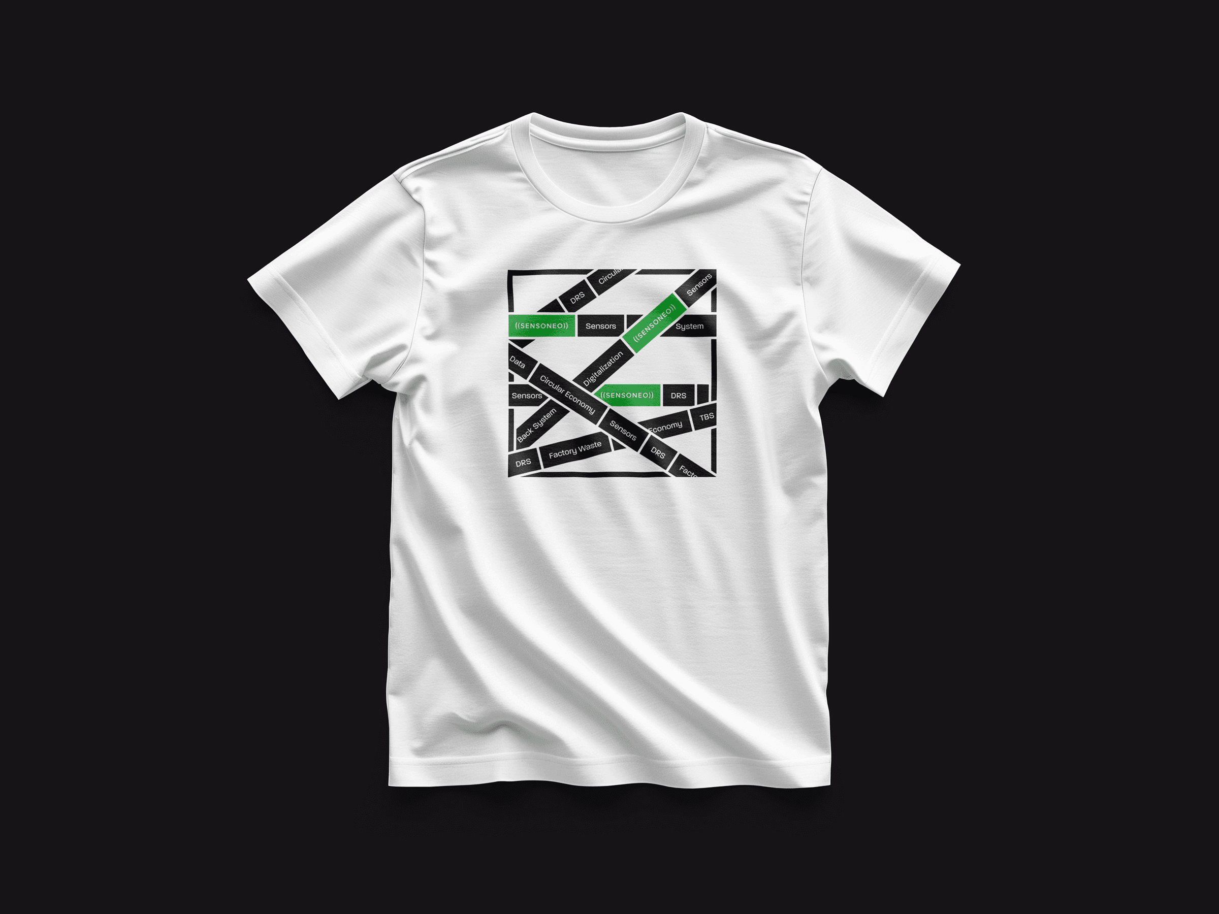White T-shirt with a graphic of layered Sensoneo-branded labels.