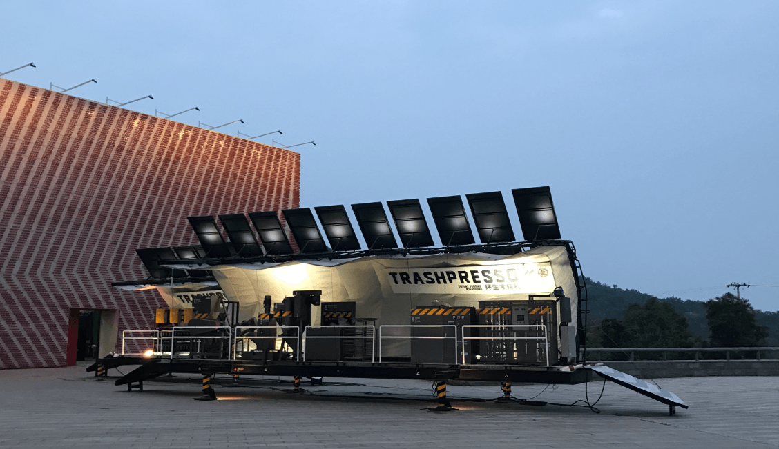 One of the most futuristic zero-waste solutions comes from Taiwan-based company MINIWIZ, with its innovative mobile recycling unit known as TRASHPRESSO. This solar-powered recycling station transforms plastic bottles and fabric waste into durable tiles that can be used in construction — all on-site and off-grid.