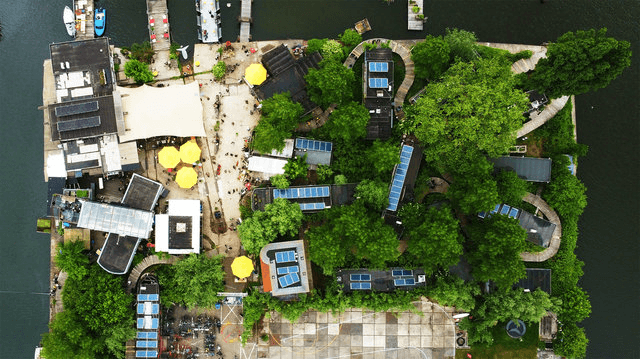 The site features repurposed houseboats placed on land, renovated to serve as creative workspaces and studios. These upcycled structures are equipped with eco-technologies such as composting toilets, solar panels, and rainwater filtration systems, demonstrating how existing materials can be adapted for modern use.